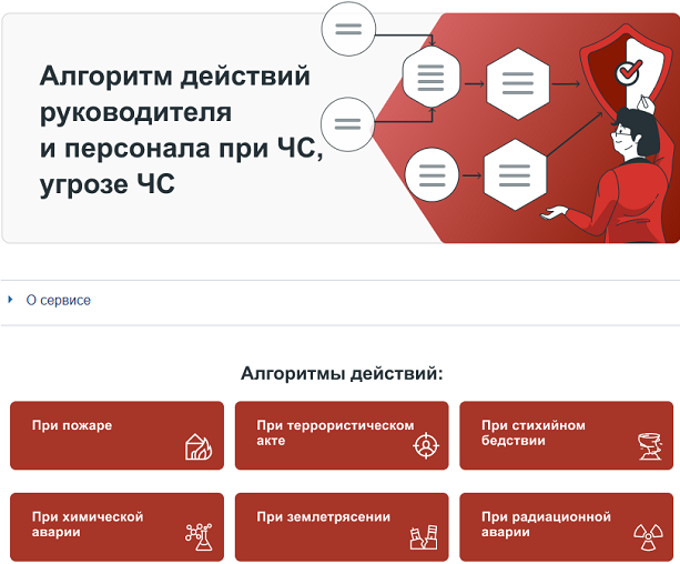 С алгоритмами действий для руководителя и персонала при иных видах ЧС или их угрозах можно ознакомиться в сервисе "Алгоритм действий руководителя и персонала при ЧС, угрозе ЧС".
