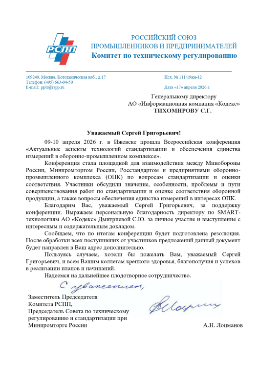 Консорциум "Кодекс" получил благодарность от Российского союза промышленников и предпринимателей