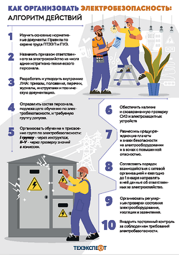 В системе "Техэксперт: Охрана труда" появилась новая инфографика "Как организовать электробезопасность: алгоритм действий".