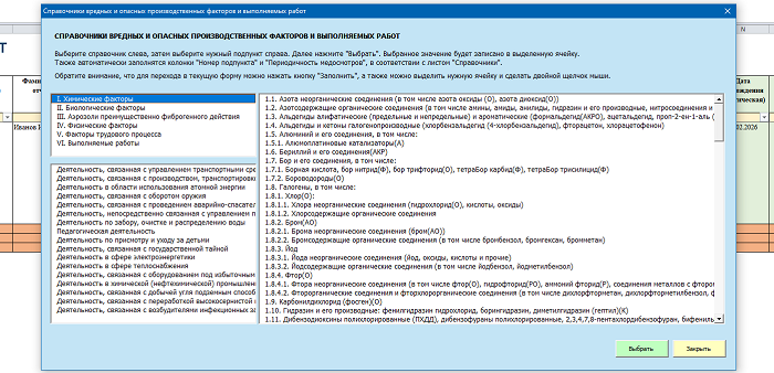 - При выборе вредного фактора из встроенного перечня планировщик автоматически проставляет периодичность медосмотров и номер пункта по Приказу Минздрава № 29н.