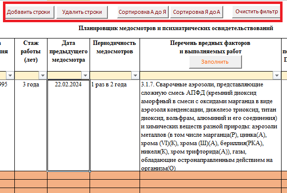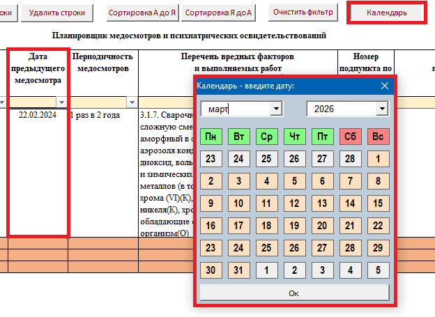 Мы обновили Excel-планировщик по медосмотрам в системе "Техэксперт: Охрана труда": теперь он подставляет периодичность осмотров из встроенного справочника, помогает отслеживать даты прохождения медосмотров и психиатрических освидетельствований, а также фильтрует список по нужным параметрам.